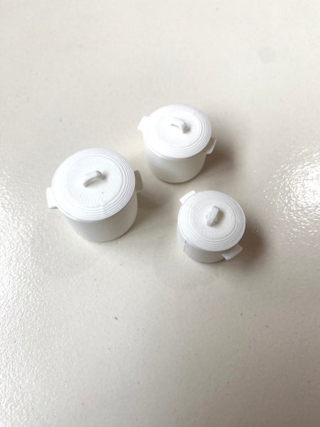 set of 3 pots with lid { total 6 pcs}  size: 24mm, 22mm, 20mm pla material can be painted with acrylic colours. uses: miniature item, miniature keychains, magnets etc. View more
